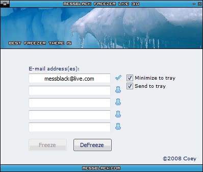 Freezer Live é um programa para o congelamento de contas do msn, se voce tem aquele amigo chato que fica te enchendo o saco quando voce ta no msn e bloqueá-lo não é o bastante, voce quer deixar ele sem entrar no msn? faça o seguinte, baixe este programa Freezer Live, ele congela o msn da vitima mais com um porém, a pessoa tem que estar off-line para voce fazer o cangelamento, este na minha opnião é o melhor para congelar pois voce pode congelar até 5 msn’s de chatos, é só voce colocar o msn do chato na caixinha e apertar Freeze.